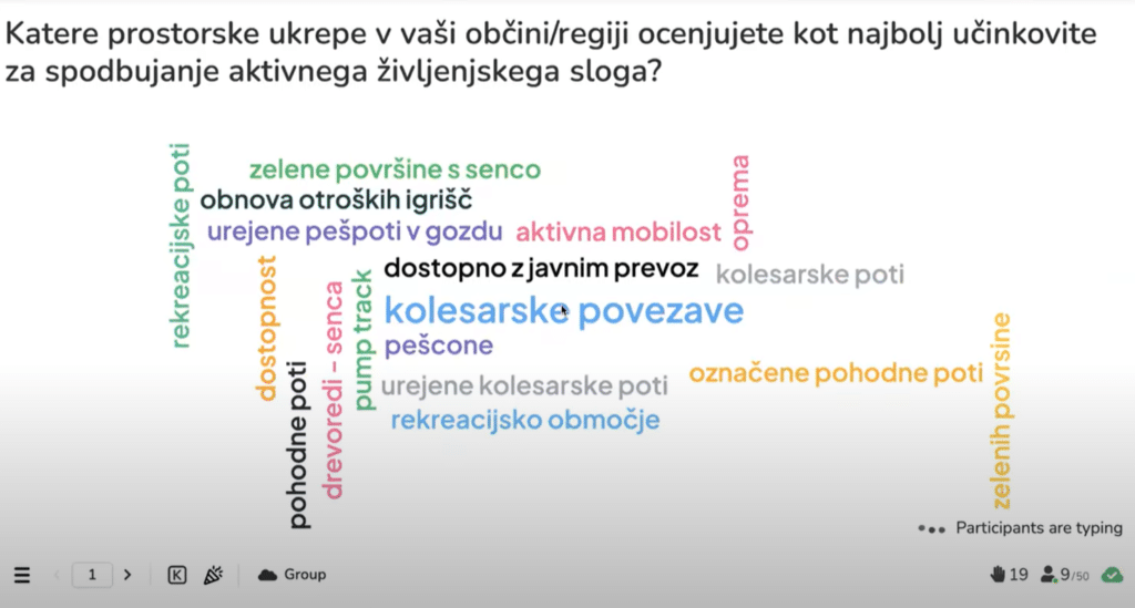 V razpravi, ki je sledila med partnerji konzorcija, občinami in regijami, so bile najprej izpostavljene težnje razvoja zelenih sistemov na ravni regije in zelene infrastrukture (ReSPR50), pri čemer so bile omenjena različna priporočila objavljena na spletnih straneh MNVP (za izdelavo regionalnih prostorskih planov, urbanističnih zasnov, krajinskih zasnov) ter izpostavljena uporabnost publikacije DPR – Zeleni sistem v mestih in naseljih. V nadaljevanju, so se lahko udeleženci dejavno vključili v razpravljalni del z odgovori na kratka interaktivna vprašanja preko spletnega orodja. Razpravljali so o tem, katere so po njihovem mnenju ključne ovire za vključevanje priporočil o zelenih površinah v občinske in regionalne dokumente (OPN, OPPN, razvojni načrti …). Poleg tega so izpostavili, katere prostorske ukrepe v svojih občinah in regijah ocenjujejo kot najbolj učinkovite za spodbujanje aktivnega življenjskega sloga. Pomemben del razprave pa je bil namenjen tudi vprašanju, katere vsebine s področja aktivnega življenjskega sloga je smiselno naslavljati skupno – na medobčinski ali regionalni ravni.