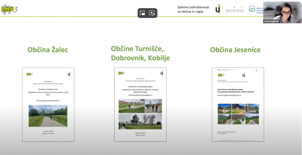 V četrtek, 25. septembra 2025 je v organizaciji Skupnosti občin Slovenije, Urbanističnega inštituta RS ter preostalih partnerjev programa Ven za zdravje 3 potekalo spletno izobraževanje z naslovom Zagotavljanje zelenih površin v podporo zdravju v občinah in regijah. Izobraževalne vsebine so tokrat naslavljale predstavnike razvojnih regij in občin Slovenije v podporo njihovim prizadevanjem na področjih kakovosti življenjskega okolja, prostorskega razvoja, javnega zdravja in spodbujanja telesne aktivnosti prebivalcev. Dogodek je moderiral Tomaž Gorenc z Inštituta za okolje in zdravje.